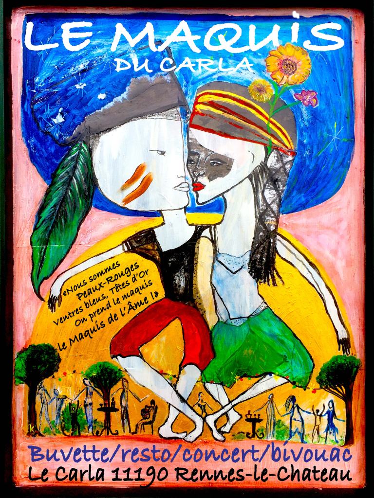 Les 3 sens du mot « maquis » résume bien l’état d’esprit dans lequel nous ouvrons, au sein de l’oasis du Carla, cet espace culturel en plein air: à la fois terme de sciences naturelles signifiant un espace de végétation typique méditerranéen mais aussi terme historique signifiant un rassemblement de résistants conscients et encore terme populaire en Afrique de l’Ouest signifiant un lieu en campagne où bien manger, écouter de la bonne musique live et faire la fête pour célébrer la vie ! Avec en exergue une citation inspirée de Joseph Delteil « Nous sommes Peaux-rouges, ventres bleus, têtes d’or, on prend le maquis, le Maquis de l’Âme ! », le Maquis du Carla s’ouvre donc comme un espace de création artistique partagée autour de la musique du monde du duo chant/danse UT&CO. Les artistes invités présenteront leur création le vendredi soir dans une ambiance plutôt intime et participeront à une création musicale festive le samedi soir autour d’UT&CO. Principalement axé sur la musique et la danse le Maquis du Carla accueillera aussi des expositions de peinture, projections de film, soirées poésie, pièces de théâtre, circassiens…